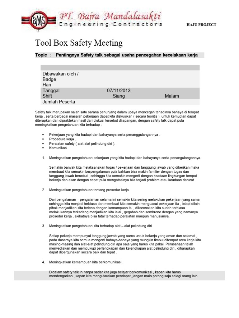 Safety talk merupakan salah satu sarana penunjang dalam upaya mencegah terjadinya bahaya di tempat