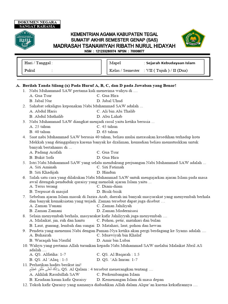 A. Berilah Tanda Silang (x) Pada Huruf A, B, C, dan D pada Jawaban yang Benar!