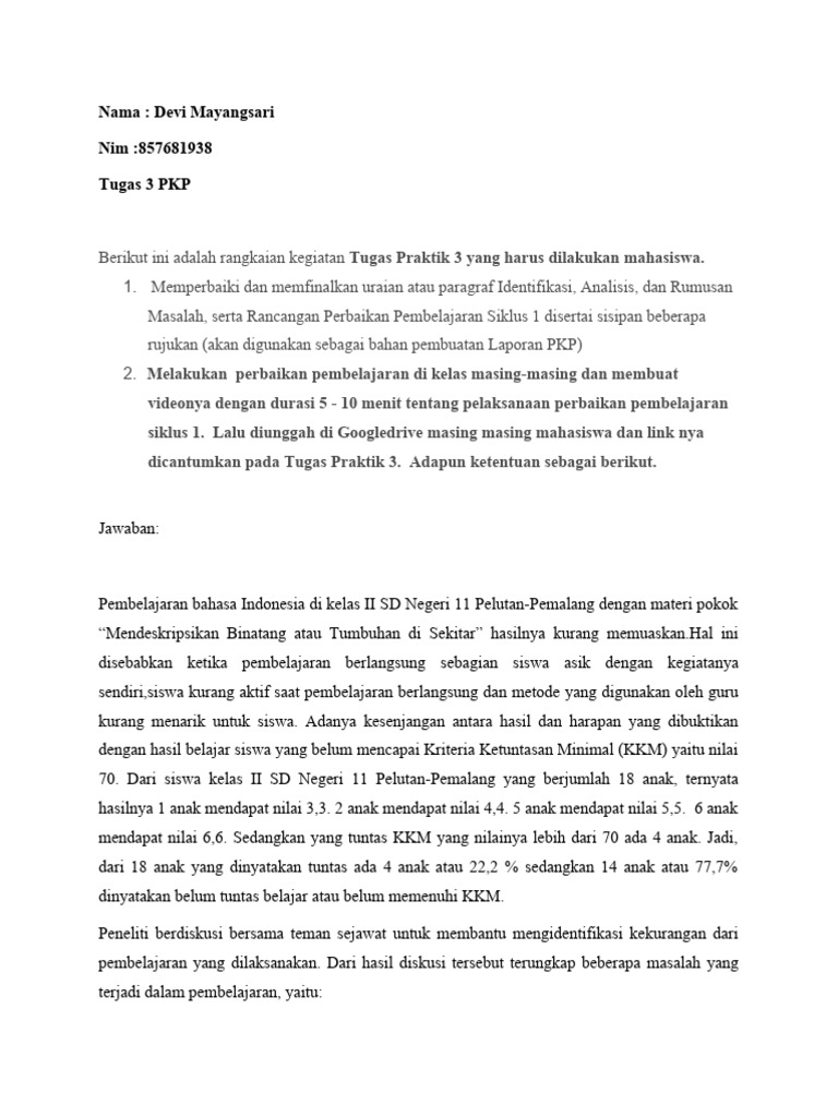 Masalah, serta Rancangan Perbaikan Pembelajaran Siklus 1 disertai sisipan beberapa