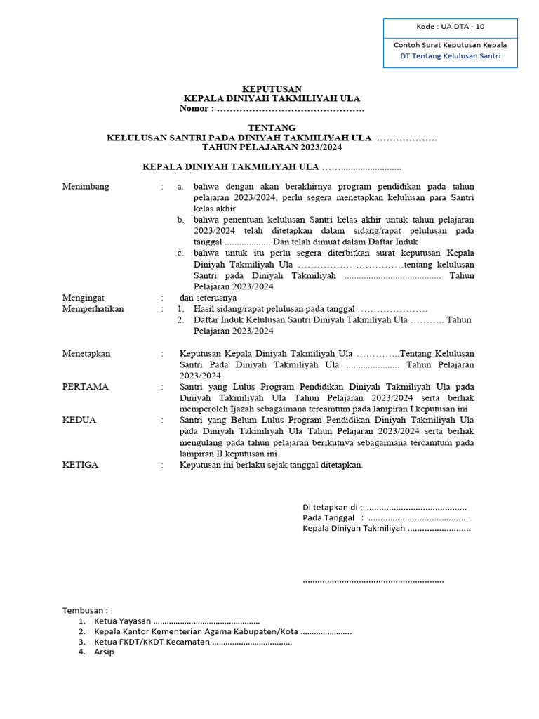 Menetapkan : Keputusan Kepala Diniyah Takmiliyah Ula …………..Tentang Kelulusan