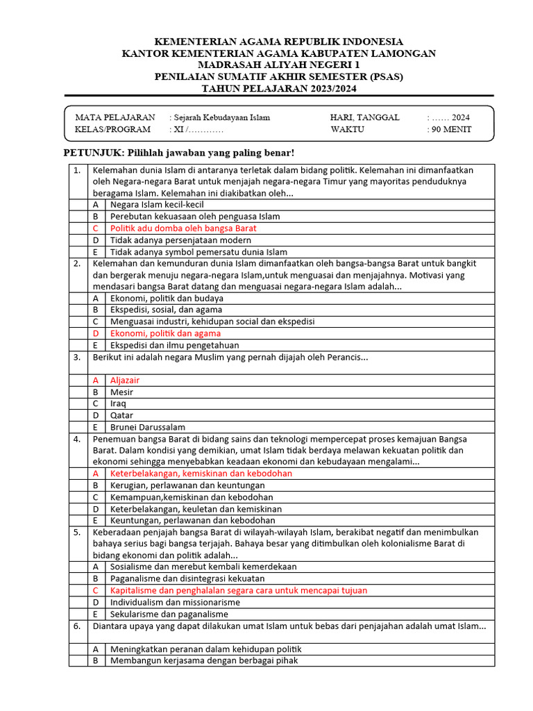 MATA PELAJARAN : Sejarah Kebudayaan Islam HARI, TANGGAL : …… 2024