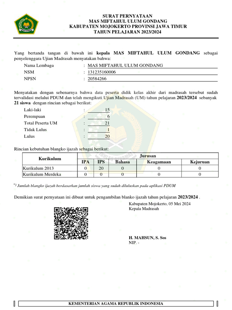 Yang bertanda tangan di bawah ini kepala MAS MIFTAHUL ULUM GONDANG sebagai