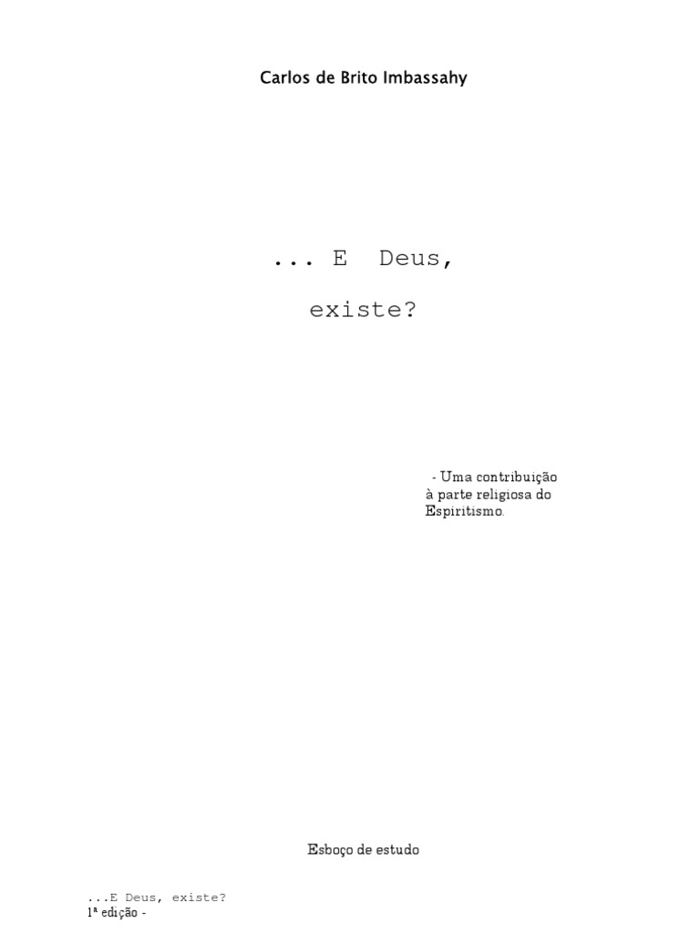 2 Ficha catalogrfica feita na fonte I262d Imbassahy, Carlos de Brito - 1931 ...E Deus, Existe? - ensaio de estudo religioso contendo um tratado teonmico. Prefcio de Mrio Cavalcanti de Mello - contm ..... pginas, ndice e bibliografia. (cidade) (editora) ano 1. Espiritismo 2. Teonomia I. Ttulo CDD 133.90