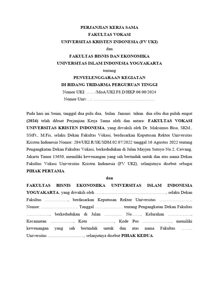 (2024) telah dibuat Perjanjian Kerja Sama oleh dan antara: FAKULTAS VOKASI
