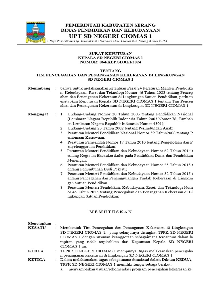 enetapkan Keputusan Kepala SD NEGERI CIOMAS 1 tentang Tim Penceg