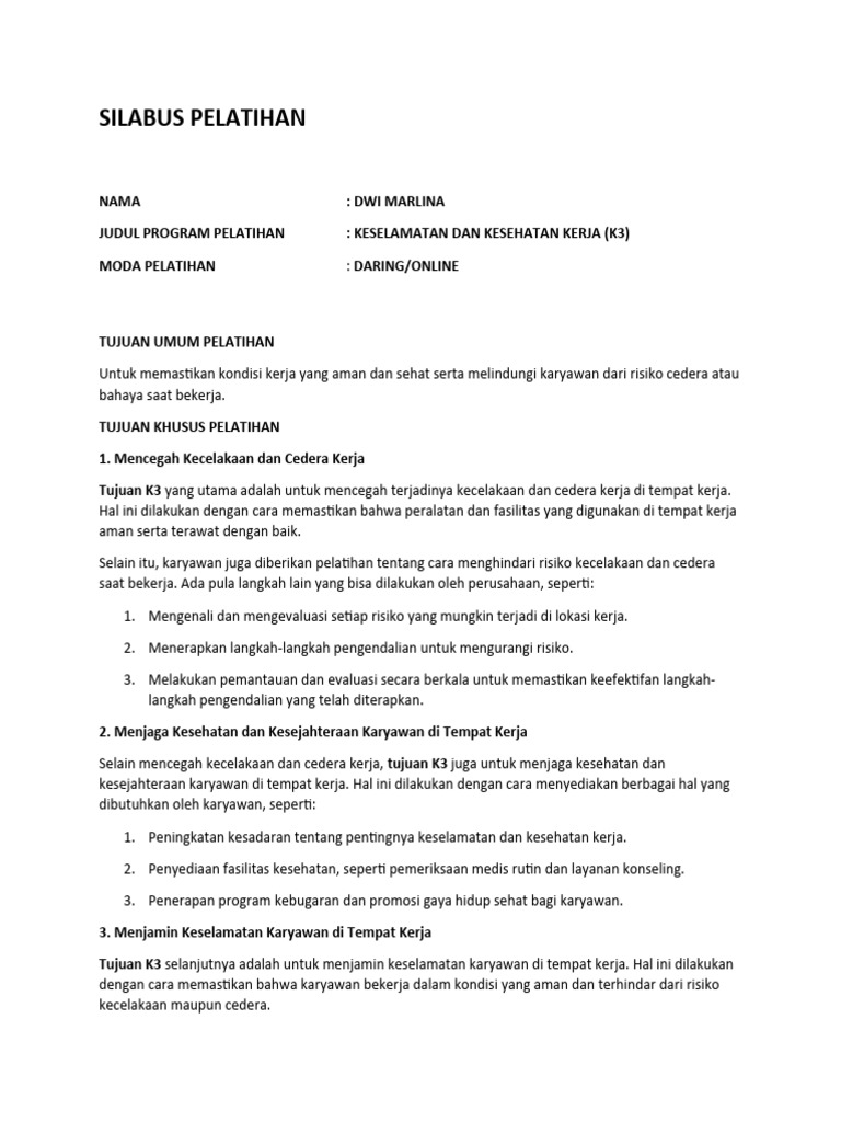 JUDUL PROGRAM PELATIHAN : KESELAMATAN DAN KESEHATAN KERJA (K3)
