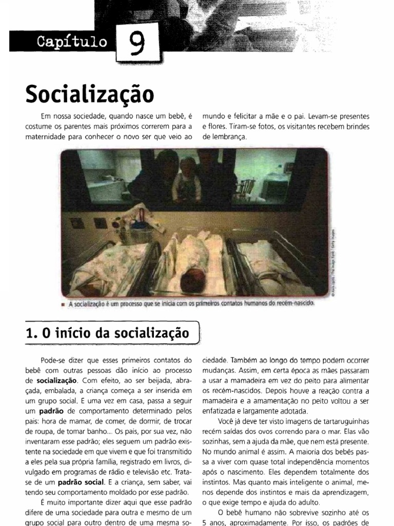 Pode-se dizer que esses primeiros contatos do beb com outras pessoas do incio ao processo de socializao. Com efeito, ao ser beijada, abraada, embalada, a criana comea a ser inserida em um grupo social. E uma vez em casa, passa a seguir um padro de comportamento determinado pelos pais: hora de mamar, de comer, de dormir, de trocar de roupa, de tomar banho ... Os pais, por sua vez, no inventaram esse padro; eles seguem um padro existente na sociedade em que vivem e que foi transmitido a eles pela sua prpria famlia, registrado em livros, divulgado em programas de rdio e televiso etc. Tratase de um padro social. E a criana, sem saber, vai tendo seu comportamento moldado por esse padro. muito importante dizer aqui que esse padro difere de uma sociedade para outra e mesmo de um grupo social para outro dentro de uma mesma sociedade. Tambm ao longo do tempo podem ocorrer mudanas. Assim, em certa poca as mes passaram a usar a mamadeira em vez do peito para alimentar os recm-nascidos. Depois houve a reao contra a mamadeira e a amamentao no peito voltou a ser enfatizada e largamente adotada. Voc j deve ter visto imagens de tartaruguinhas recm sadas dos ovos correndo para o mar. Elas vo sozinhas, sem a ajuda da me, que nem est presente. No mundo animal assim. A maioria dos bebs passa a viver com quase total independncia momentos aps o nascimento. Eles dependem totalmente dos instintos. Mas quanto mais inteligente o animal, menos depende dos instintos e mais da aprendizagem, o que exige tempo e ajuda do adulto. O beb humano no sobrevive sozinho at os 5 anos, aproximadamente. Por isso, os padres de