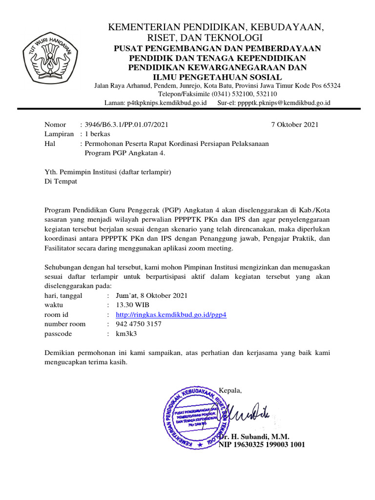 Nomor : 3946/B6.3.1/PP.01.07/2021 7 Oktober 2021