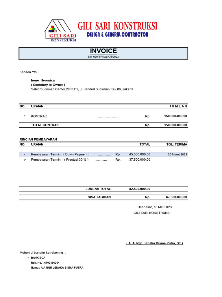 1 Pembayaran Termin I ( Down Payment ) .............. Rp. 45.000.000,00 26 Maret 2023