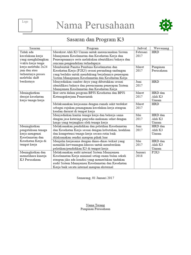 jam dan atau Kesehatan Kerja (P2K3) sesuai perundang-undangan 2017 Perusahaan
