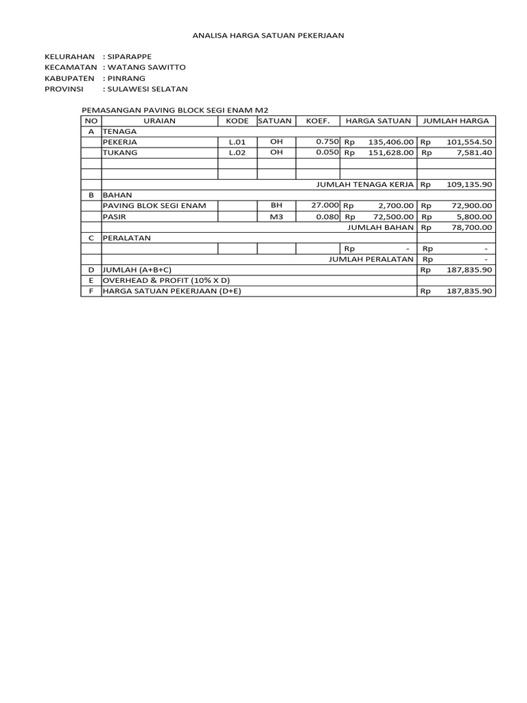 1 Pek. Pemasangan Paving Block 172.29 m2 130,000.00 Rp 22,397,700