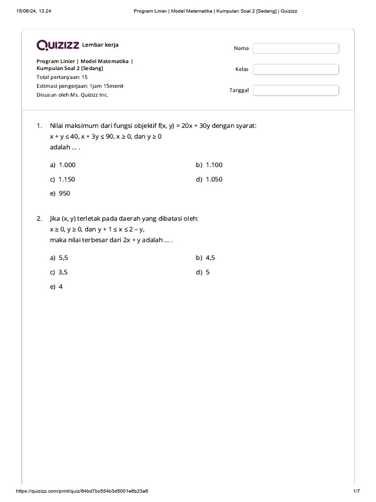 15/06/24, 13.24 Program Linier | Model Matematika | Kumpulan Soal 2 [Sedang] | Quizizz