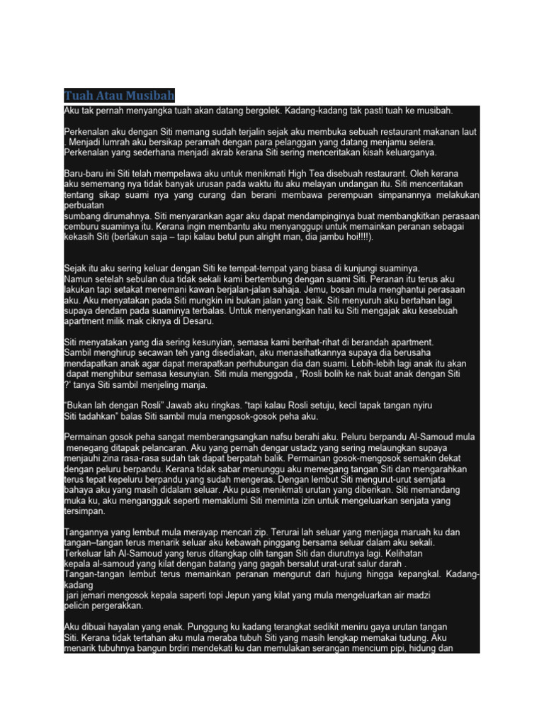 lagi. Tipah membiarkan saja. Kerana kurang selesa Pak Aji menyuruh Tipah menanggalkan baju T-nya.