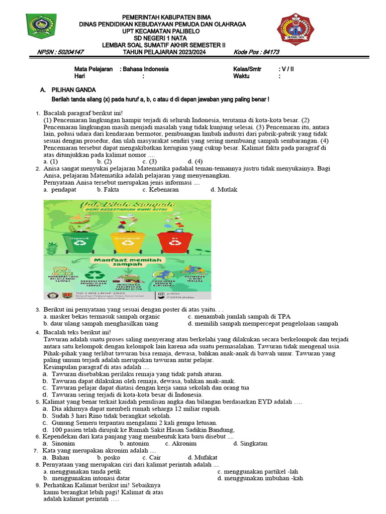 Mata Pelajaran : Bahasa Indonesia Kelas/Smtr : V / II