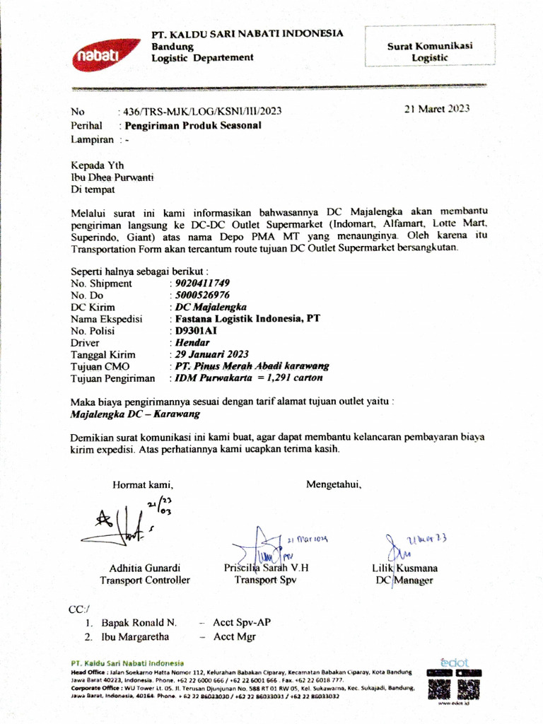 pengiriman langsung ke DC-DC Outlet Supermarket (Indomart, Alfamart, Lotte Mart,