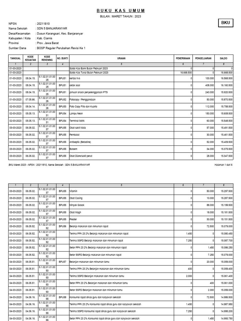 BKU Maret 2023 - NPSN : 20211810, Nama Sekolah : SDN 5 BANJARANYAR Halaman 1 dari 6