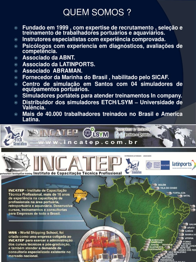 Fundado em 1999 , com expertise de recrutamento , seleo e treinamento de trabalhadores porturios e aquavirios. Instrutores especialistas com experincia comprovada. Psiclogos com experiencia em diagnsticos, avaliaes de competncia. Associado da ABNT. Associado da LATINPORTS. Associado ABRAMAN. Fornecedor da Marinha do Brasil , habilitado pelo SICAF. Centro de simulao em Santos com 04 simuladores de equipamentos porturios. Simuladores portteis para atender treinamentos In company. Distribuidor dos simuladores ETCH/LSYM Universidade de Valncia. Mais de 40.000 trabalhadores treinados no Brasil e America Latina.