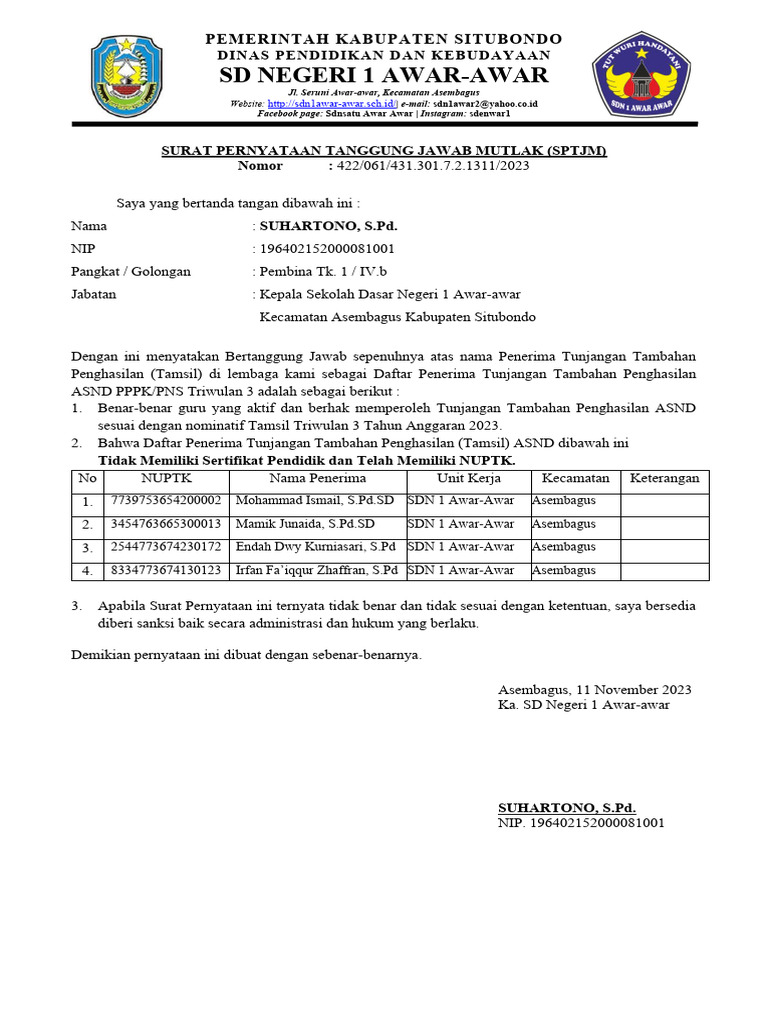 Jabatan : Kepala Sekolah Dasar Negeri 1 Awar-awar