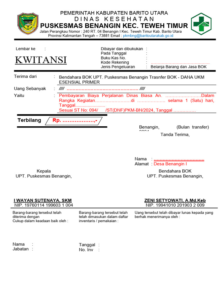 Terima Dari : Bendahara BOK UPT. Puskesmas Benangin Trasnfer BOK - DANA