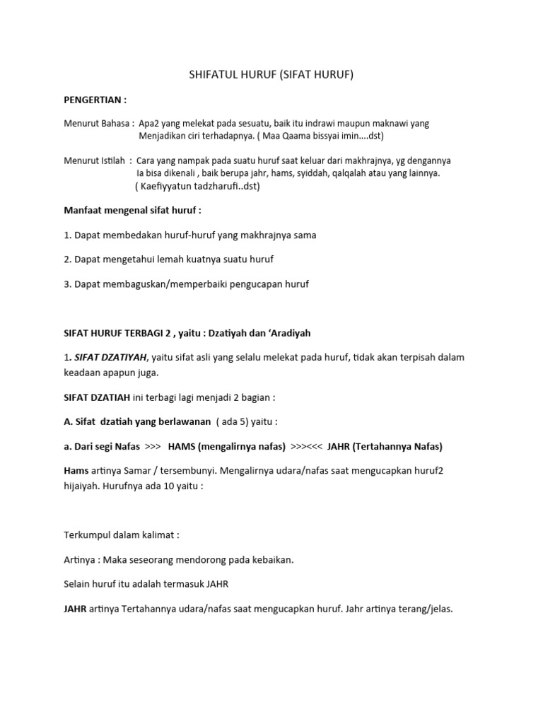 1. SIFAT DZATIYAH, yaitu sifat asli yang selalu melekat pada huruf, tidak akan terpisah dalam