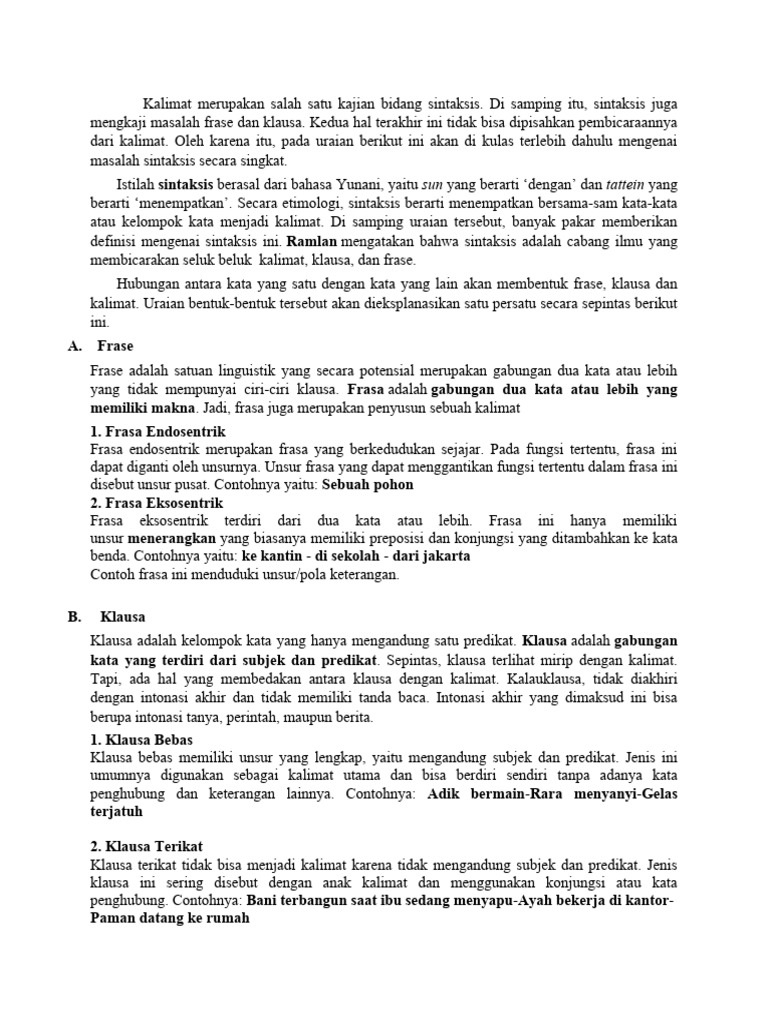akhir terdiri atas klausa. Kalimat adalah gabungan beberapa kata yang sedikitnya mengandung
