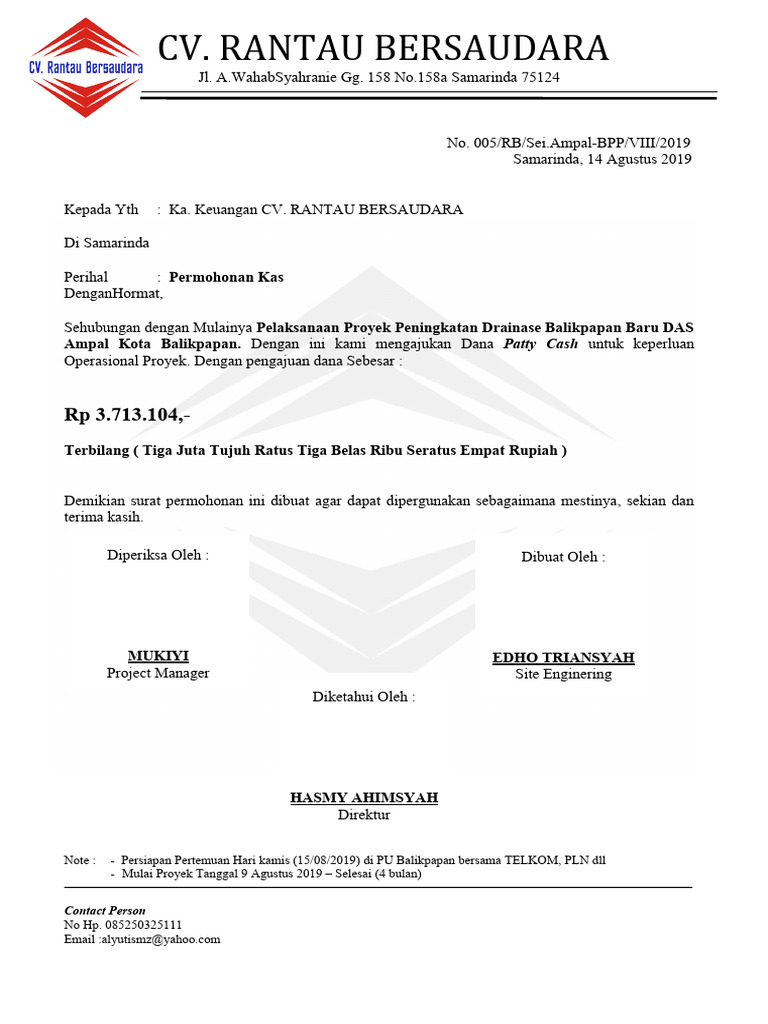 Kepada Yth : Ka. Keuangan CV. RANTAU BERSAUDARA