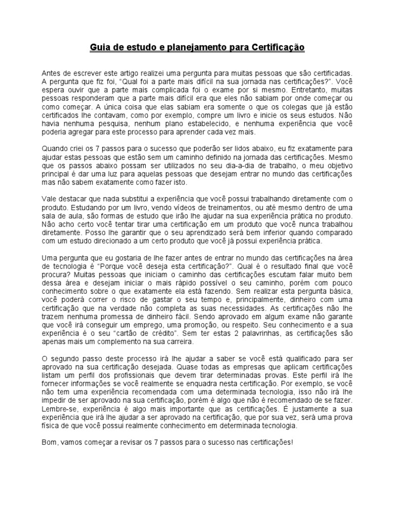 Antes de escrever este artigo realizei uma pergunta para muitas pessoas que so certificadas. A pergunta que fiz foi, Qual foi a parte mais difcil na sua jornada nas certificaes?. Voc espera ouvir que a parte mais complicada foi o exame por si mesmo. Entretanto, muitas pessoas responderam que a parte mais difcil era que eles no sabiam por onde comear ou como comear. A nica coisa que elas sabiam era somente o que os colegas que j esto certificados lhe contavam, como por exemplo, compre um livro e inicie os seus estudos. No havia nenhuma pesquisa, nenhum plano estabelecido, e nenhuma experincia que voc poderia agregar para este processo para aprender cada vez mais. Quando criei os 7 passos para o sucesso que podero ser lidos abaixo, eu fiz exatamente para ajudar estas pessoas que esto sem um caminho definido na jornada das certificaes. Mesmo que os passos abaixo possam ser utilizados no seu dia-a-dia de trabalho, o meu objetivo principal dar uma luz para aquelas pessoas que desejam entrar no mundo das certificaes mas no sabem exatamente como fazer isto. Vale destacar que nada substitui a experincia que voc possui trabalhando diretamente com o produto. Estudando por um livro, vendo vdeos de treinamentos, ou at mesmo dentro de uma sala de aula, so formas de estudo que iro lhe ajudar na sua experincia prtica no produto. No acho certo voc tentar tirar uma certificao em um produto que voc nunca trabalhou diretamente. Posso lhe garantir que o seu aprendizado ser bem inferior quando comparado com um estudo direcionado a um certo produto que voc j possui experincia prtica. Uma pergunta que eu gostaria de lhe fazer antes de entrar no mundo das certificaes na rea de tecnologia Porque voc deseja esta certificao?. Qual o resultado final que voc procura? Muitas pessoas que iniciam o caminho das certificaes escutam falar muito bem dessa rea e desejam iniciar o mais rpido possvel o seu caminho, porm com pouco conhecimento sobre o que exatamente ela est fazendo. Sem realizar esta pergunta bsica, voc poder correr o risco de gastar o seu tempo e, principalmente, dinheiro com uma certificao que na verdade no completa as suas necessidades. As certificaes no lhe trazem nenhuma promessa de dinheiro fcil. Sendo aprovado em algum exame no garante que voc ir conseguir um emprego, uma promoo, ou respeito. Seu conhecimento e a sua experincia o seu carto de crdito. Sem ter estas 2 palavrinhas, as certificaes so apenas mais um complemento na sua carreira. O segundo passo deste processo ir lhe ajudar a saber se voc est qualificado para ser aprovado na sua certificao desejada. Quase todas as empresas que aplicam certificaes listam um perfil dos profissionais que devem tirar determinadas provas. Este perfil ir lhe fornecer informaes se voc realmente se enquadra nesta certificao. Por exemplo, se voc no tem uma experincia recomendada com uma determinada tecnologia, isso no ir lhe impedir de ser aprovado na sua certificao, porm algo que no recomendado de se fazer. Lembre-se, experincia algo mais importante que as certificaes. justamente a sua experincia que ir lhe ajudar a ser aprovado na certificao, que por sua vez, ser uma prova fsica de que voc possui realmente conhecimento em determinada tecnologia. Bom, vamos comear a revisar os 7 passos para o sucesso nas certificaes!