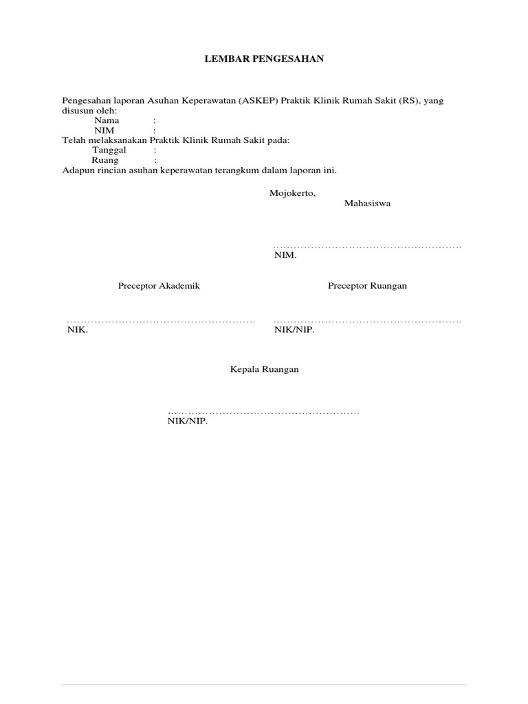 Pengesahan laporan Asuhan Keperawatan (ASKEP) Praktik Klinik Rumah Sakit (RS), yang