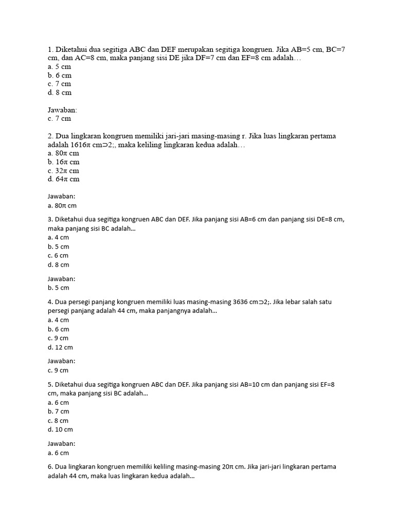 3. Diketahui dua segitiga kongruen ABC dan DEF. Jika panjang sisi AB=6 cm dan panjang sisi DE=8 cm,