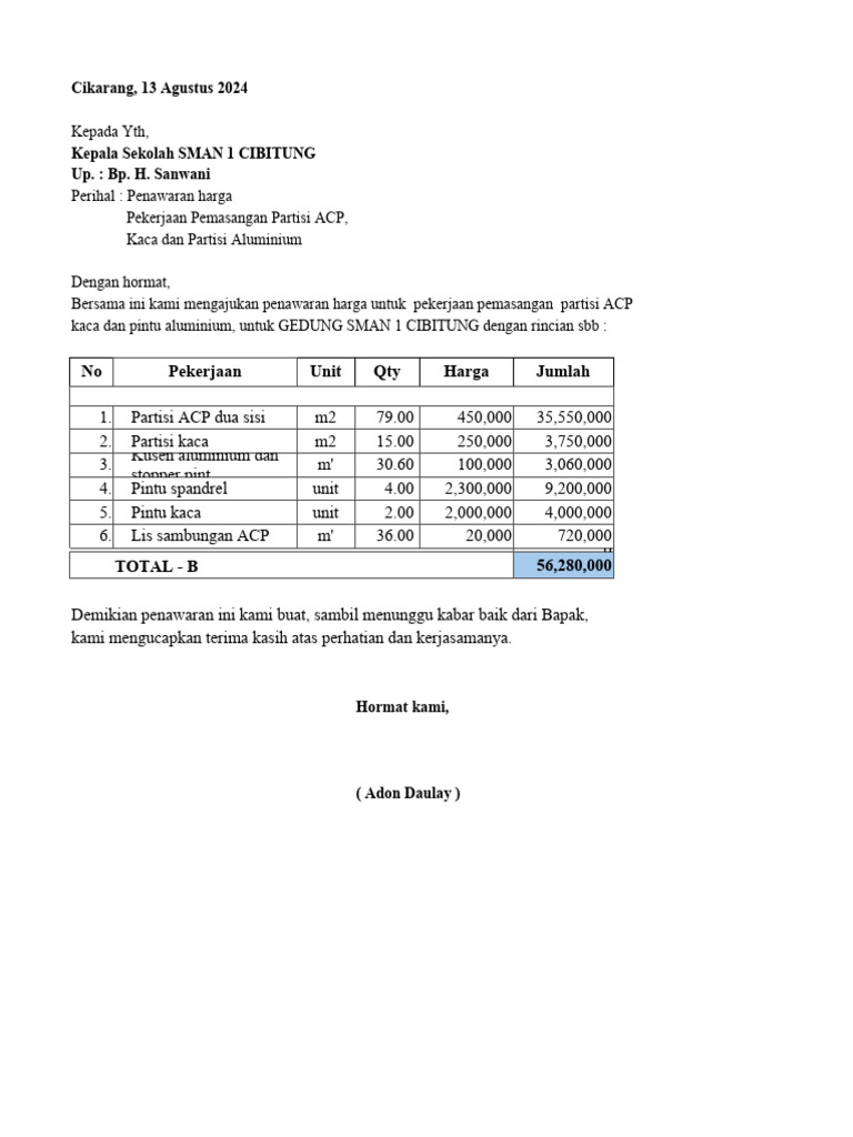 Bersama ini kami mengajukan penawaran harga untuk pekerjaan pemasangan partisi ACP