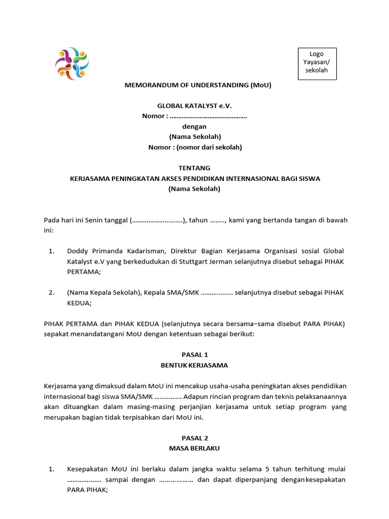 1. Kesepakatan MoU ini berlaku dalam jangka waktu selama 5 tahun terhitung mulai