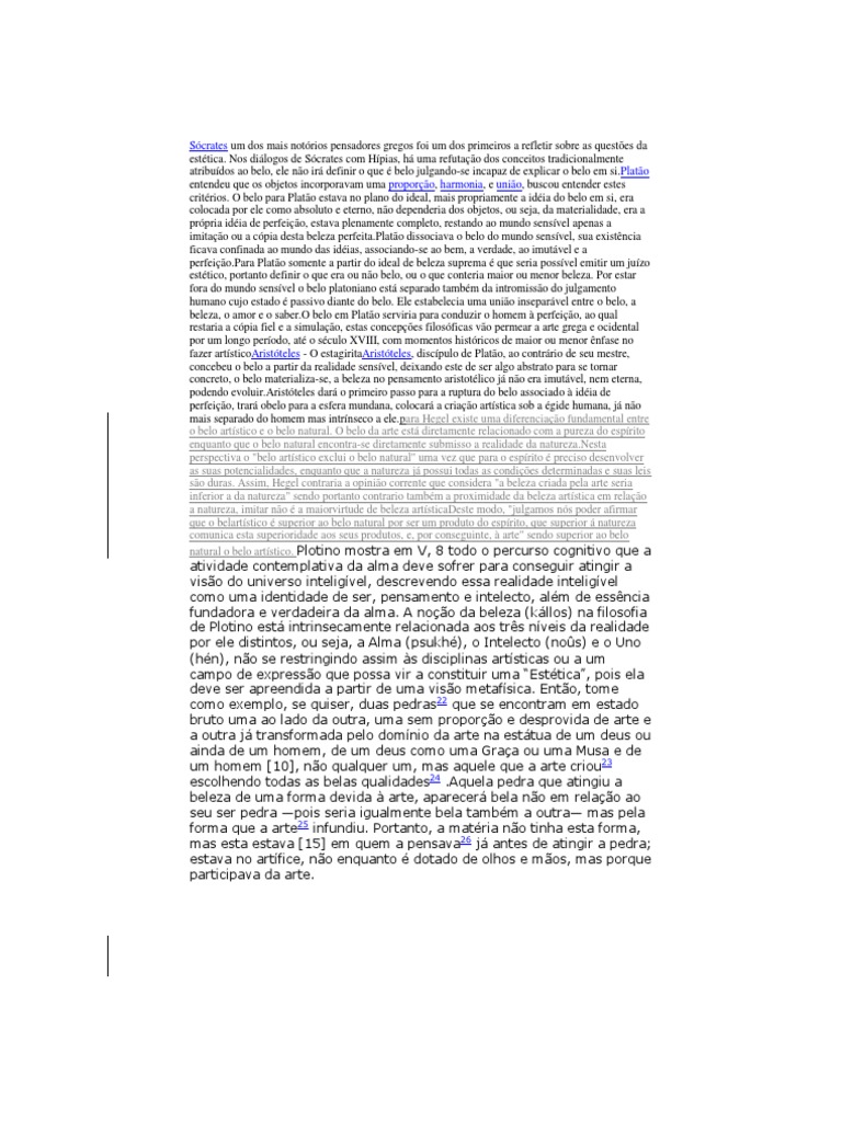 Nos dilogos de Scrates com Hpias, h uma refutao dos conceitos tradicionalmente atribudos ao belo, ele no ir definir o que belo julgando-se incapaz de explicar o belo em si.Plato entendeu que os objetos incorporavam uma proporo, harmonia, e unio, buscou entender estes critrios. O belo para Plato estava no plano do ideal, mais propriamente a idia do belo em si, era colocada por ele como absoluto e eterno, no dependeria dos objetos, ou seja, da materialidade, era a prpria idia de perfeio, estava plenamente completo, restando ao mundo sensvel apenas a imitao ou a cpia desta beleza perfeita.Plato dissociava o belo do mundo sensvel, sua existncia ficava confinada ao mundo das idias, associando-se ao bem, a verdade, ao imutvel e a perfeio.Para Plato somente a partir do ideal de beleza suprema que seria possvel emitir um juzo esttico, portanto definir o que era ou no belo, ou o que conteria maior ou menor beleza. Por estar fora do mundo sensvel o belo platoniano est separado tambm da intromisso do julgamento humano cujo estado passivo diante do belo. Ele estabelecia uma unio inseparvel entre o belo, a beleza, o amor e o saber.O belo em Plato serviria para conduzir o homem perfeio, ao qual restaria a cpia fiel e a simulao, estas concepes filosficas vo permear a arte grega e ocidental por um longo perodo, at o sculo XVIII, com momentos histricos de maior ou menor nfase no fazer artsticoAristteles - O estagiritaAristteles, discpulo de Plato, ao contrrio de seu mestre, concebeu o belo a partir da realidade sensvel, deixando este de ser algo abstrato para se tornar concreto, o belo materializa-se, a beleza no pensamento aristotlico j no era imutvel, nem eterna, podendo evoluir.Aristteles dar o primeiro passo para a ruptura do belo associado idia de perfeio, trar obelo para a esfera mundana, colocar a criao artstica sob a gide humana, j no mais separado do homem mas intrnseco a ele.para Hegel existe uma diferenciao fundamental entre o belo artstico e o belo natural. O belo da arte est diretamente relacionado com a pureza do esprito enquanto que o belo natural encontra-se diretamente submisso a realidade da natureza.Nesta perspectiva o "belo artstico exclui o belo natural" uma vez que para o esprito preciso desenvolver as suas potencialidades, enquanto que a natureza j possui todas as condies determinadas e suas leis so duras. Assim, Hegel contraria a opinio corrente que considera "a beleza criada pela arte seria inferior a da natureza" sendo portanto contrario tambm a proximidade da beleza artstica em relao a natureza, imitar no a maiorvirtude de beleza artsticaDeste modo, "julgamos ns poder afirmar que o belartstico superior ao belo natural por ser um produto do esprito, que superior natureza comunica esta superioridade aos seus produtos, e, por conseguinte, arte" sendo superior ao belo natural o belo artstico. Plotino mostra em V, 8 todo o percurso cognitivo que a