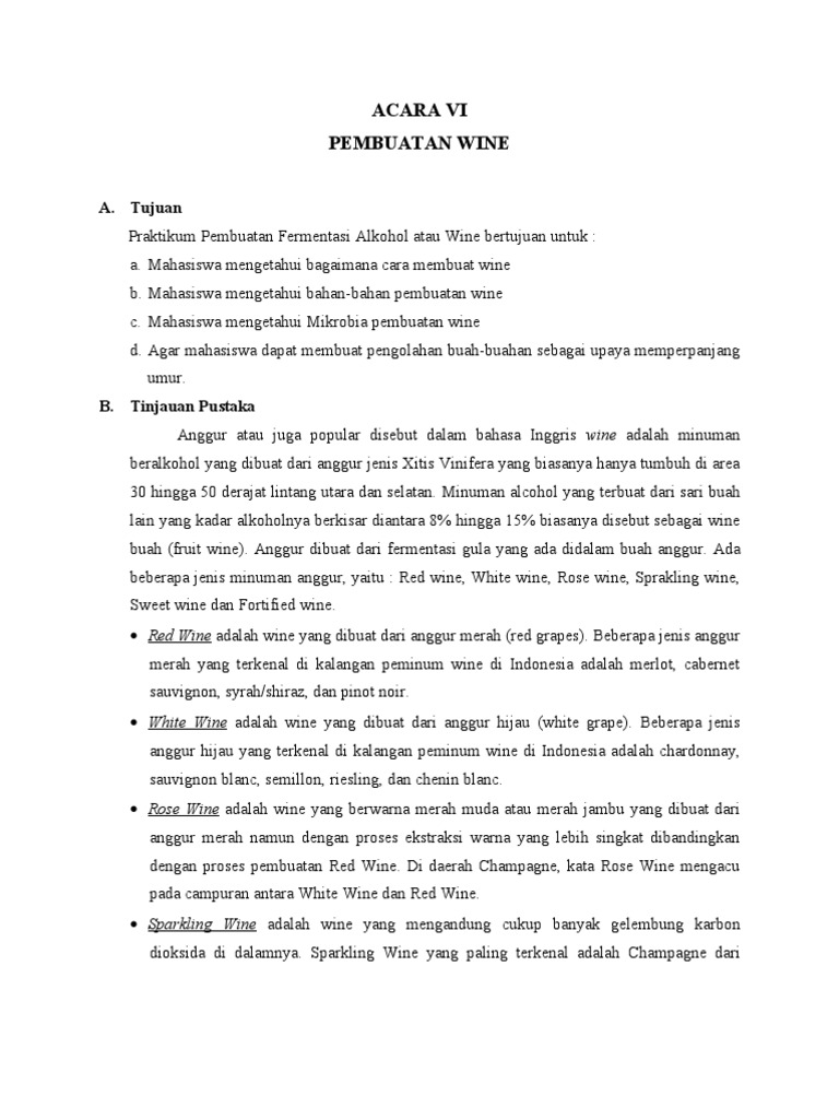 A. Tujuan Praktikum Pembuatan Fermentasi Alkohol atau Wine bertujuan untuk : a. Mahasiswa mengetahui bagaimana cara membuat wine b. Mahasiswa mengetahui bahan-bahan pembuatan wine c. Mahasiswa mengetahui Mikrobia pembuatan wine d. Agar mahasiswa dapat membuat pengolahan buah-buahan sebagai upaya memperpanjang umur. B. Tinjauan Pustaka Anggur atau juga popular disebut dalam bahasa Inggris wine adalah minuman beralkohol yang dibuat dari anggur jenis Xitis Vinifera yang biasanya hanya tumbuh di area 30 hingga 50 derajat lintang utara dan selatan. Minuman alcohol yang terbuat dari sari buah lain yang kadar alkoholnya berkisar diantara 8% hingga 15% biasanya disebut sebagai wine buah (fruit wine). Anggur dibuat dari fermentasi gula yang ada didalam buah anggur. Ada beberapa jenis minuman anggur, yaitu : Red wine, White wine, Rose wine, Sprakling wine, Sweet wine dan Fortified wine. Red Wine adalah wine yang dibuat dari anggur merah (red grapes). Beberapa jenis anggur merah yang terkenal di kalangan peminum wine di Indonesia adalah merlot, cabernet sauvignon, syrah/shiraz, dan pinot noir. White Wine adalah wine yang dibuat dari anggur hijau (white grape). Beberapa jenis anggur hijau yang terkenal di kalangan peminum wine di Indonesia adalah chardonnay, sauvignon blanc, semillon, riesling, dan chenin blanc. Rose Wine adalah wine yang berwarna merah muda atau merah jambu yang dibuat dari anggur merah namun dengan proses ekstraksi warna yang lebih singkat dibandingkan dengan proses pembuatan Red Wine. Di daerah Champagne, kata Rose Wine mengacu pada campuran antara White Wine dan Red Wine. Sparkling Wine adalah wine yang mengandung cukup banyak gelembung karbon dioksida di dalamnya. Sparkling Wine yang paling terkenal adalah Champagne dari