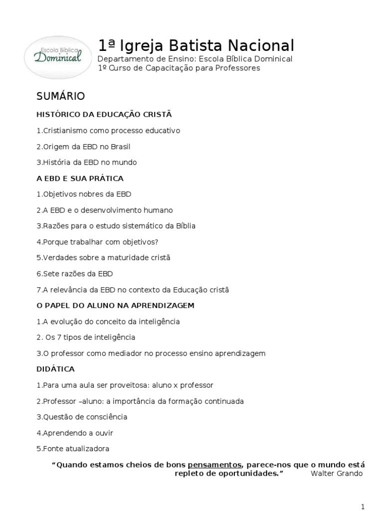 HISTRICO DA EDUCAO CRIST 1.Cristianismo como processo educativo 2.Origem da EBD no Brasil 3.Histria da EBD no mundo A EBD E SUA PRTICA 1.Objetivos nobres da EBD 2.A EBD e o desenvolvimento humano 3.Razes para o estudo sistemtico da Bblia 4.Porque trabalhar com objetivos? 5.Verdades sobre a maturidade crist 6.Sete razes da EBD 7.A relevncia da EBD no contexto da Educao crist O PAPEL DO ALUNO NA APRENDIZAGEM 1.A evoluo do conceito da inteligncia 2. Os 7 tipos de inteligncia 3.O professor como mediador no processo ensino aprendizagem DIDTICA 1.Para uma aula ser proveitosa: aluno x professor 2.Professor aluno: a importncia da formao continuada 3.Questo de conscincia 4.Aprendendo a ouvir 5.Fonte atualizadora Quando estamos cheios de bons pensamentos, parece-nos que o mundo est repleto de oportunidades. Walter Grando