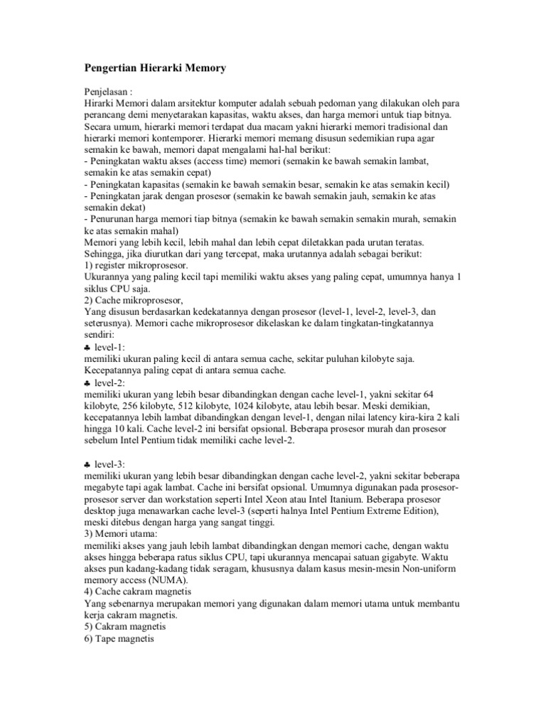 Penjelasan : Hirarki Memori dalam arsitektur komputer adalah sebuah pedoman yang dilakukan oleh para perancang demi menyetarakan kapasitas, waktu akses, dan harga memori untuk tiap bitnya. Secara umum, hierarki memori terdapat dua macam yakni hierarki memori tradisional dan hierarki memori kontemporer. Hierarki memori memang disusun sedemikian rupa agar semakin ke bawah, memori dapat mengalami hal-hal berikut: - Peningkatan waktu akses (access time) memori (semakin ke bawah semakin lambat, semakin ke atas semakin cepat) - Peningkatan kapasitas (semakin ke bawah semakin besar, semakin ke atas semakin kecil) - Peningkatan jarak dengan prosesor (semakin ke bawah semakin jauh, semakin ke atas semakin dekat) - Penurunan harga memori tiap bitnya (semakin ke bawah semakin semakin murah, semakin ke atas semakin mahal) Memori yang lebih kecil, lebih mahal dan lebih cepat diletakkan pada urutan teratas. Sehingga, jika diurutkan dari yang tercepat, maka urutannya adalah sebagai berikut: 1) register mikroprosesor. Ukurannya yang paling kecil tapi memiliki waktu akses yang paling cepat, umumnya hanya 1 siklus CPU saja. 2) Cache mikroprosesor, Yang disusun berdasarkan kedekatannya dengan prosesor (level-1, level-2, level-3, dan seterusnya). Memori cache mikroprosesor dikelaskan ke dalam tingkatan-tingkatannya sendiri: i level-1: memiliki ukuran paling kecil di antara semua cache, sekitar puluhan kilobyte saja. Kecepatannya paling cepat di antara semua cache. i level-2: memiliki ukuran yang lebih besar dibandingkan dengan cache level-1, yakni sekitar 64 kilobyte, 256 kilobyte, 512 kilobyte, 1024 kilobyte, atau lebih besar. Meski demikian, kecepatannya lebih lambat dibandingkan dengan level-1, dengan nilai latency kira-kira 2 kali hingga 10 kali. Cache level-2 ini bersifat opsional. Beberapa prosesor murah dan prosesor sebelum Intel Pentium tidak memiliki cache level-2. i level-3: memiliki ukuran yang lebih besar dibandingkan dengan cache level-2, yakni sekitar beberapa megabyte tapi agak lambat. Cache ini bersifat opsional. Umumnya digunakan pada prosesorprosesor server dan workstation seperti Intel Xeon atau Intel Itanium. Beberapa prosesor desktop juga menawarkan cache level-3 (seperti halnya Intel Pentium Extreme Edition), meski ditebus dengan harga yang sangat tinggi. 3) Memori utama: memiliki akses yang jauh lebih lambat dibandingkan dengan memori cache, dengan waktu akses hingga beberapa ratus siklus CPU, tapi ukurannya mencapai satuan gigabyte. Waktu akses pun kadang-kadang tidak seragam, khususnya dalam kasus mesin-mesin Non-uniform memory access (NUMA). 4) Cache cakram magnetis Yang sebenarnya merupakan memori yang digunakan dalam memori utama untuk membantu kerja cakram magnetis. 5) Cakram magnetis 6) Tape magnetis