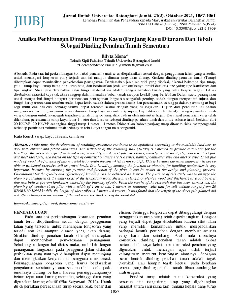 Ellyta Mona, Analisa Perhitungan Dimensi Turap Kayu (Panjang Kayu Ditanam Dan Tebal) Sebagai Dinding Penahan Tanah