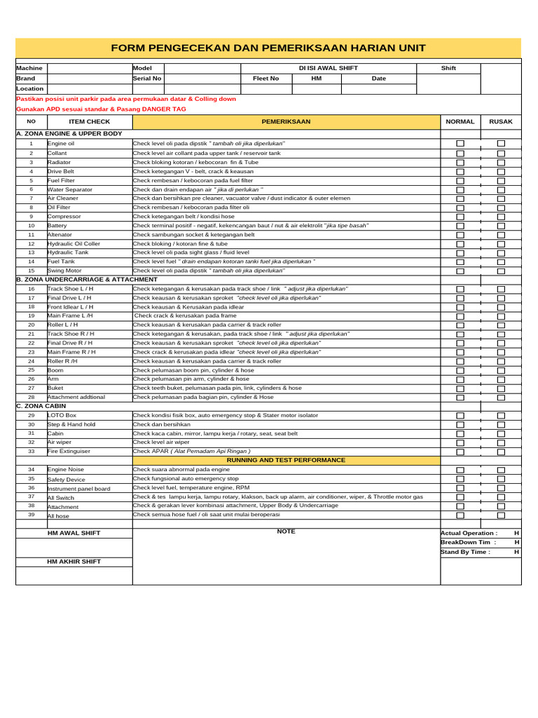 FORM PENGECEKAN DAN PEMERIKSAAN HARIAN UNIT