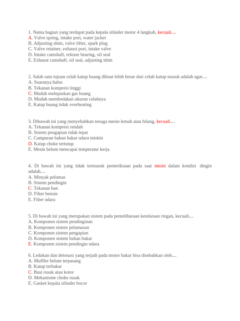 9. Yang bukan penyebab kompresi rendah pada motor bakar adalah....