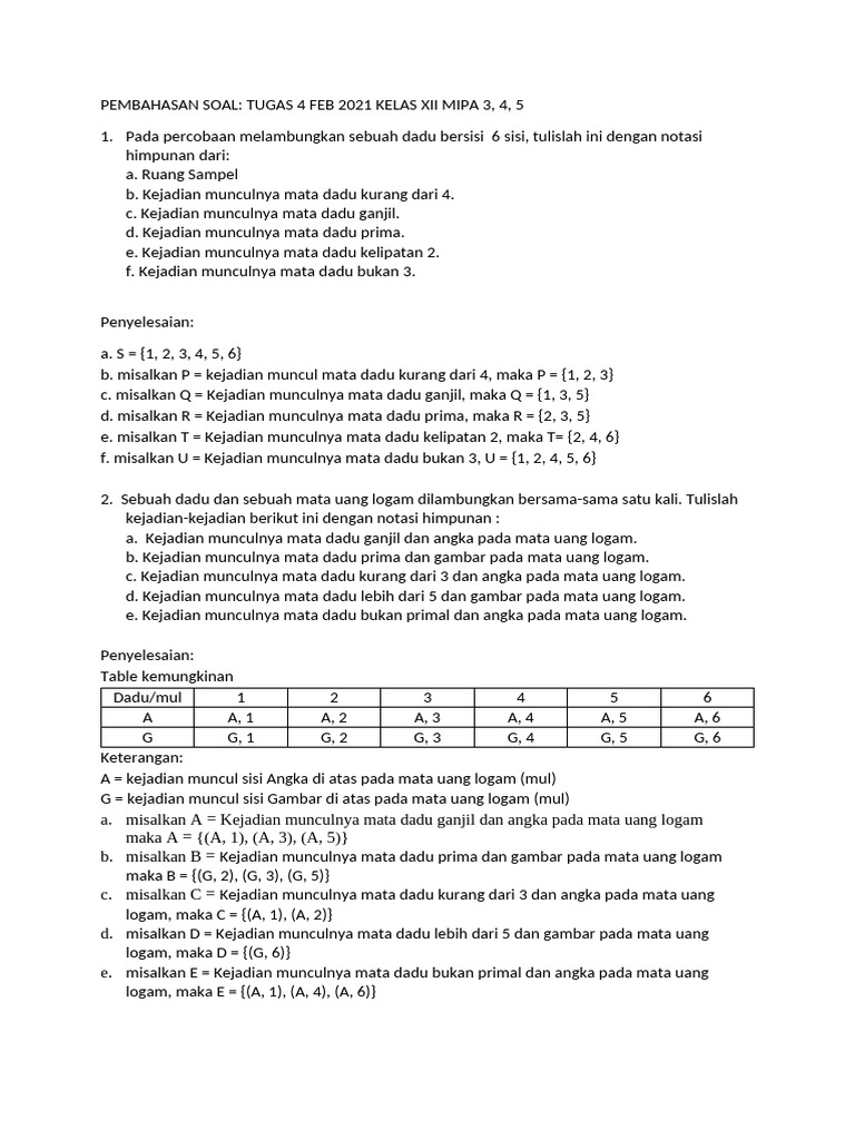 f. misalkan U = Kejadian munculnya mata dadu bukan 3, U = {1, 2, 4, 5, 6}