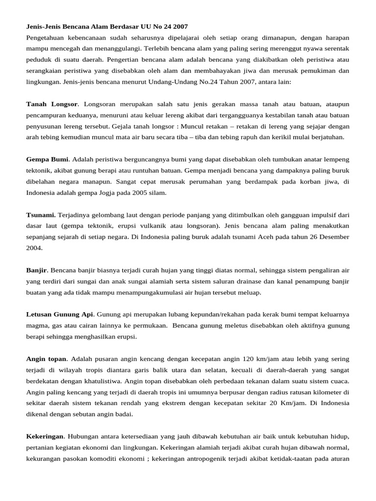 karena itu, Undang-Undang Nomor 24 Tahun 2007 tersebut juga mendefinisikan mengenai bencana alam,