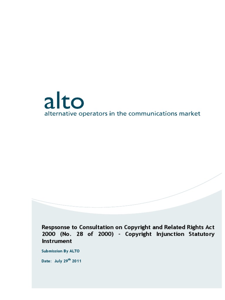 ALTO welcomes the opportunity to respond to the Department of Jobs Enterprise and Innovation DJEI, Consultation on: Copyright and Related Rights Act 2000 (No. 28 of 2000). We support DJEI consultation on this important issue and we hope that feedback and consultation responses will assist the DJEI in a positive manner. About ALTO The voice of the Irish telecoms industry, ALTO represents national and international operators in the fixed, wireless, mobile and cable sectors. Our objective is to see the creation of a dynamic and innovative telecoms market in Ireland based on the principle of fair and open competition. ALTOs mission is to represent and communicate the interests of members to senior policy makers, regulators, the business community and the media. Membership is open to authorised communications providers and currently includes a host of significant players in the industry. To date, ALTO members have invested hundreds of millions in the Irish telecoms sector and they currently employ over 3,000 people. ALTO stands for Alternative Operators in the Communications Market. Established in 1998 to represent the interests of new operators entering Ireland's telecoms market, ALTO has become the voice of the telecoms industry, representing national and international operators in the fixed, wireless, mobile and cable sectors.