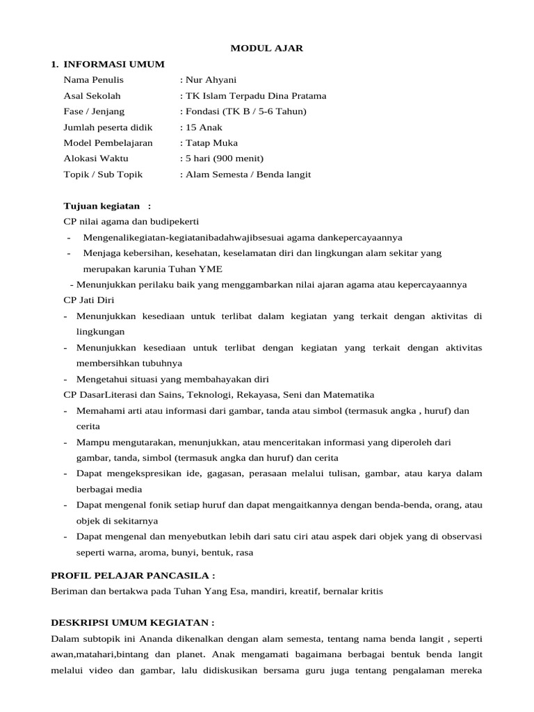 mengenal benda langit. Anak diberikan pembelajaran agar lebih memahami secara baik tentang