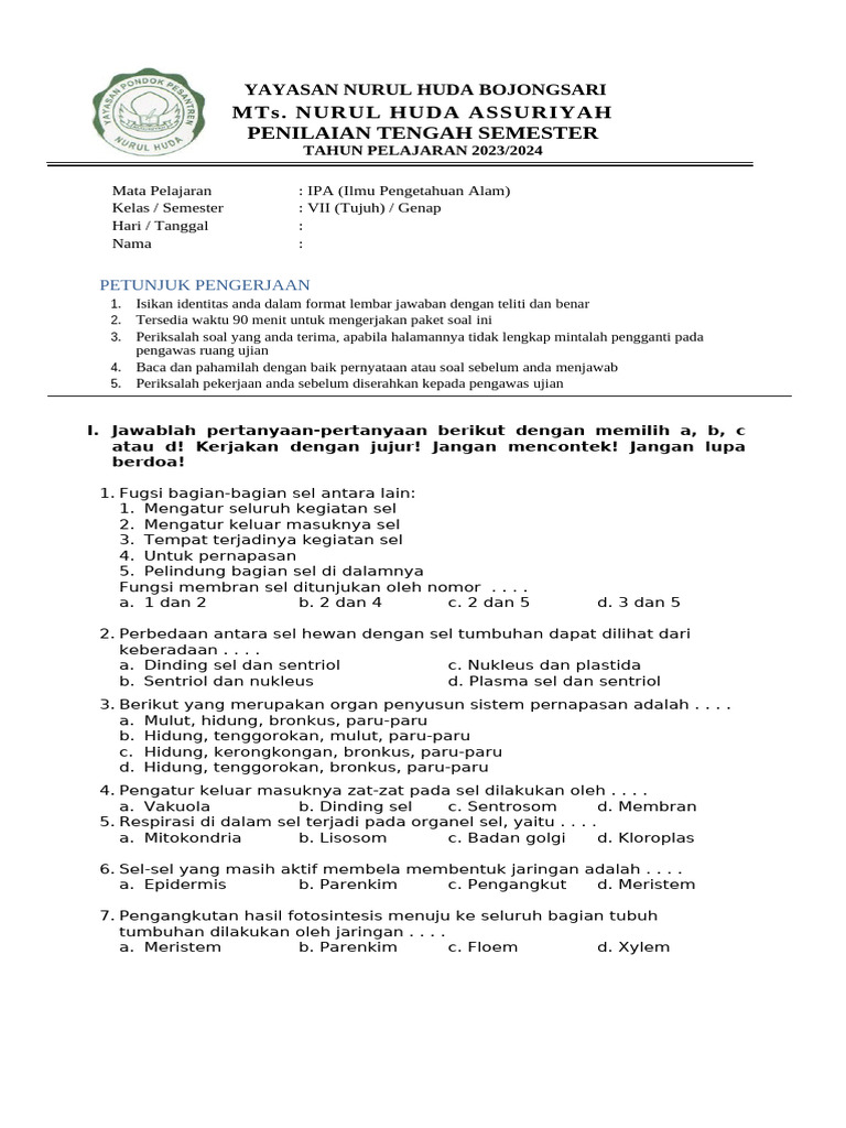 atau d! Kerjakan dengan jujur! Jangan mencontek! Jangan lupa