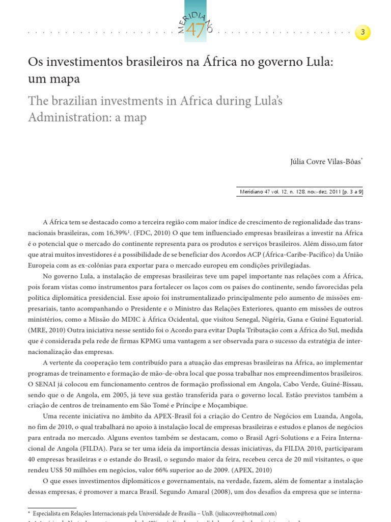 During Lulas government Brazilian investments in Africa grew prominently. The main destinations were South Africa, Angola, Libya and Mozambique. Palavras-chave: Investimentos externos brasileiros; frica; Poltica Externa do Governo Lula Key-words: Foreign investments in Brazil; Africa; Foreign Policy of the Lula government