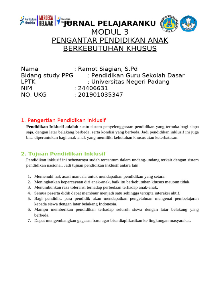 pendidikan nasional. Jadi tujuan pendidikan inklusif antara lain: