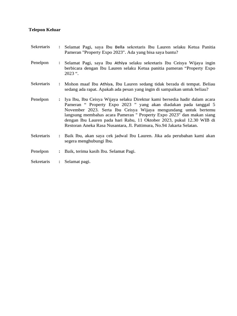 Sekretaris : Selamat Pagi, saya Ibu Bella sekretaris Ibu Lauren selaku Ketua Panitia