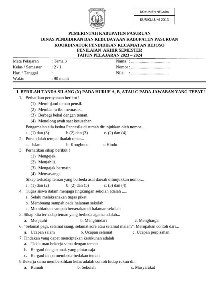 I. BERILAH TANDA SILANG (X) PADA HURUF A, B, ATAU C PADA JAWABAN YANG TEPAT !