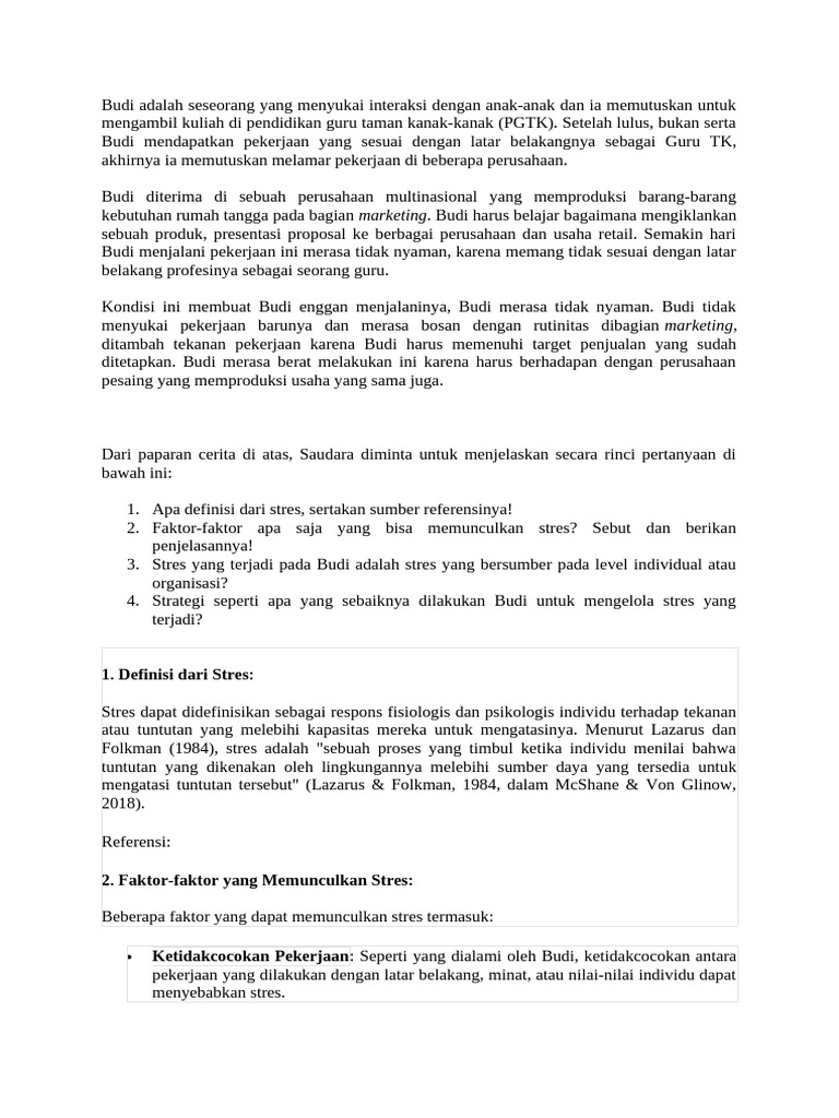 3. Stres yang terjadi pada Budi adalah stres yang bersumber pada level individual atau
