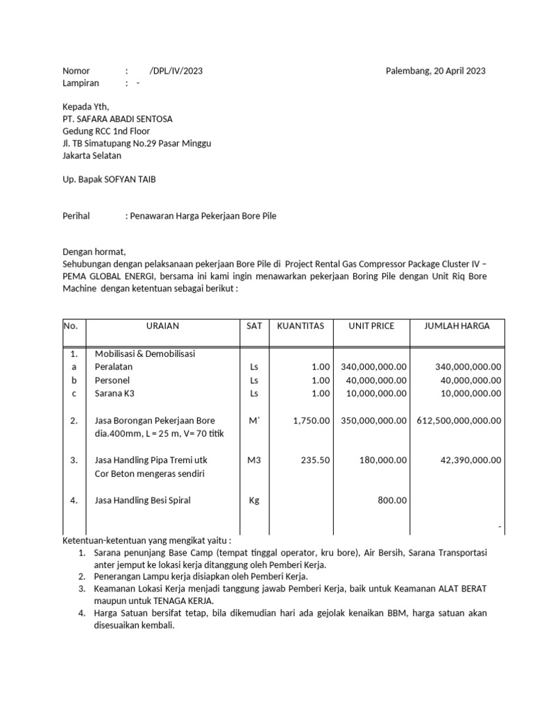 Perihal : Penawaran Harga Pekerjaan Bore Pile
