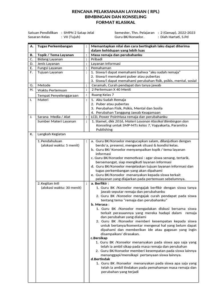 B. Topik / Tema Layanan : Masa remaja dan perubahanku